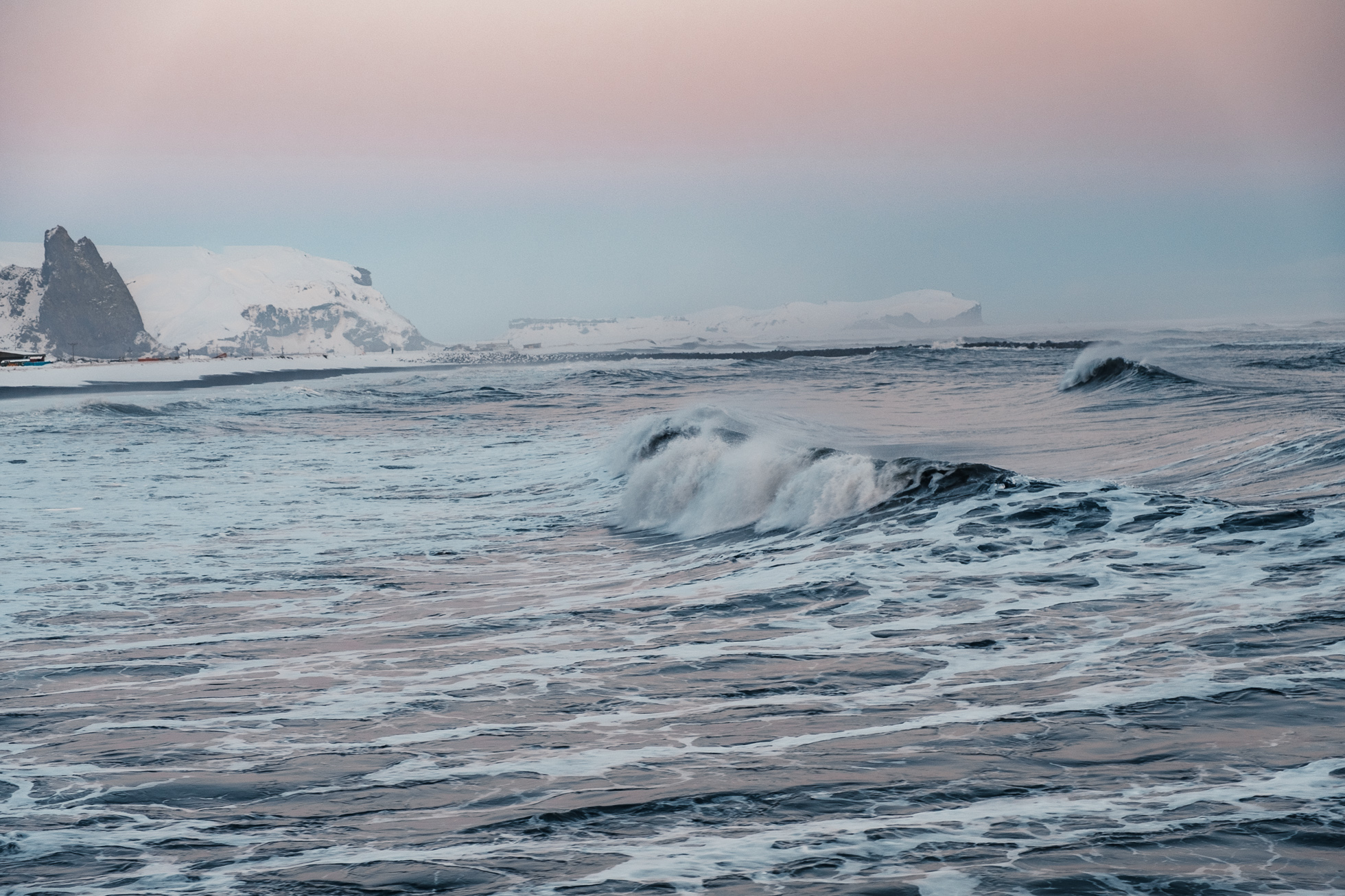The next morning we continued to the south coast of Iceland. On the way we stopped at the two waterfalls Seljalandsfoss and Skógafoss and did a short hike through the snow-covered landscape. A special highlight was Reynisfjara, a black pebble beach near Vik where we took a long walk.